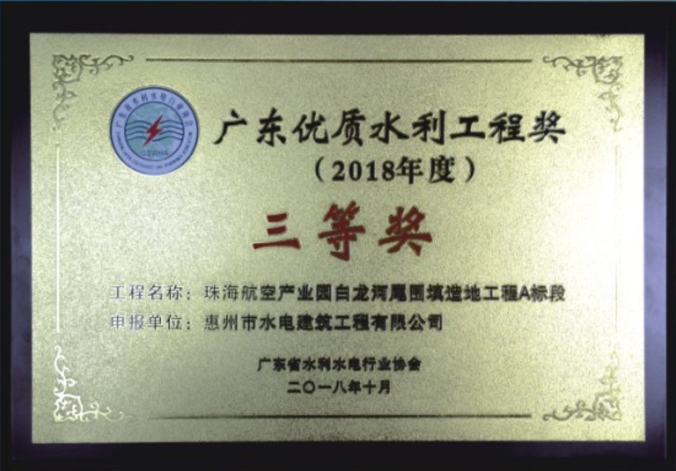 廣東優(yōu)質(zhì)水利工程獎(三等獎)——珠海航空產(chǎn)業(yè)園白龍河尾圍填造地工程A標(biāo)段