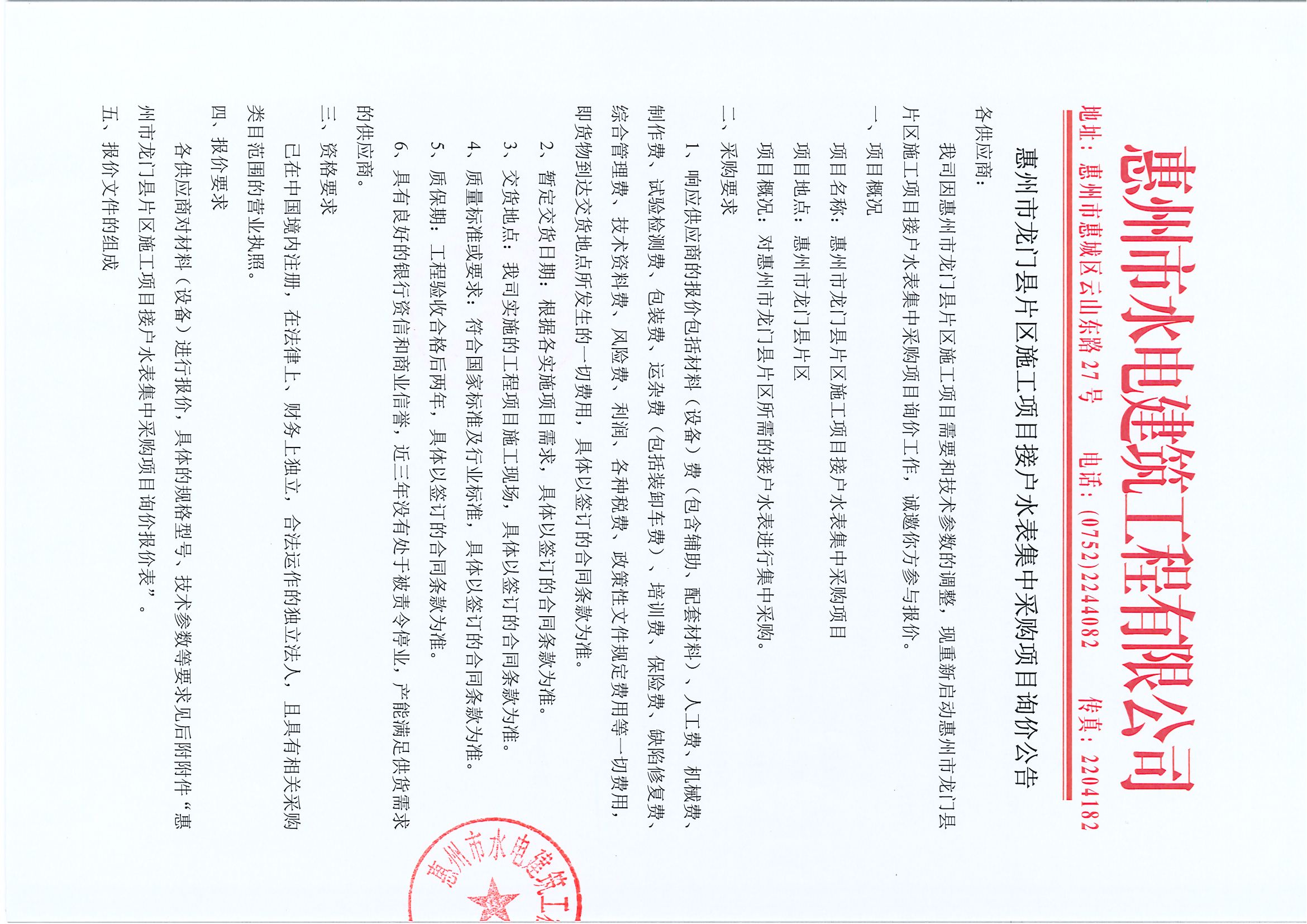 惠州市龍門縣片區(qū)施工項目接戶水表集中采購項目詢價公告