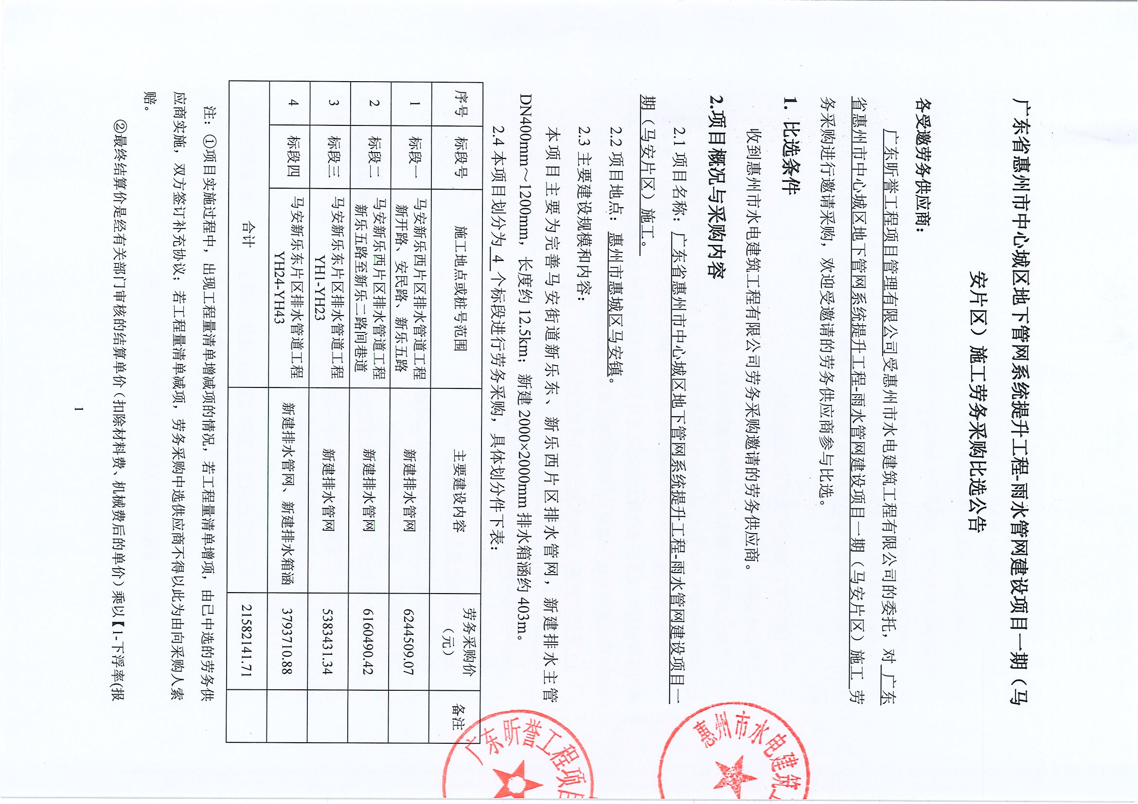 廣東省惠州市中心城區(qū)地下管網(wǎng)系統(tǒng)提升工程-雨水管網(wǎng)建設(shè)項(xiàng)目一期(馬安片區(qū))施工勞務(wù)采購(gòu)比選公告