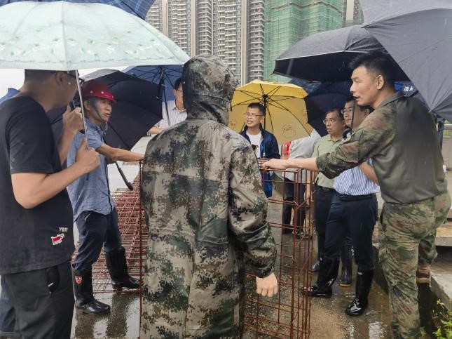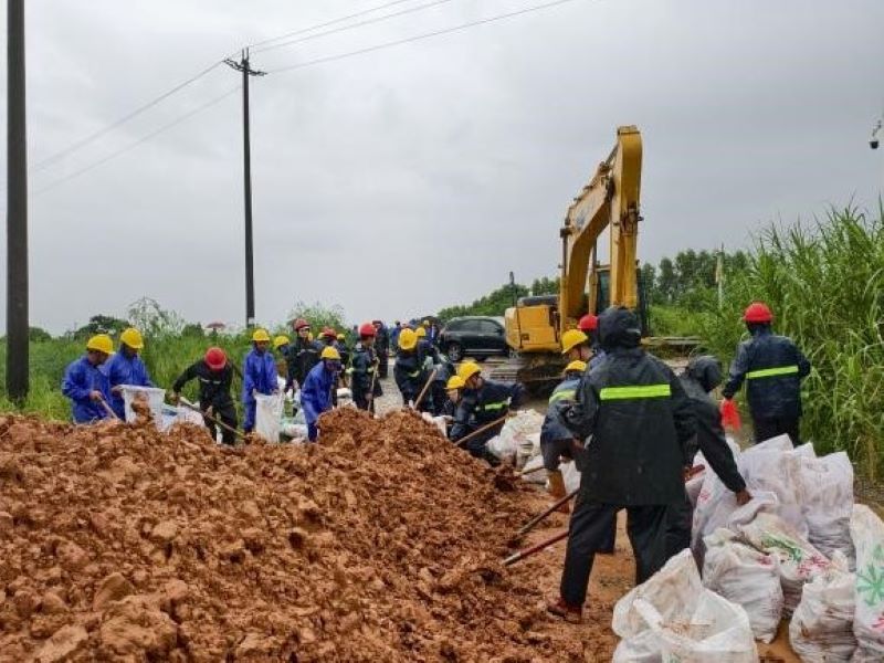 在潼湖崗頭新圍,8月5日早上,公司接到赴潼湖崗頭新圍搶險命令,搶險隊70人立即集結(jié)待命,完成應(yīng)急搶險安全技術(shù)交底工作后乘車前往仲愷高新區(qū)潼湖崗頭新圍開展子堤加高加固搶險。公司總工程師謝武帶隊趕赴險情現(xiàn)場勘查,研討搶險方案,指導(dǎo)搶險工作。12時30分,搶險人員、機械設(shè)備和搶險物資已到達現(xiàn)場第一作業(yè)點開展搶險。因連日降雨,現(xiàn)場河水水位高漲幾近漫堤,險情非常緊急。搶險隊員或鏟裝沙袋、或搬運堆砌、或機械清障,大家分工協(xié)作,有條不紊開展子堤加高。經(jīng)過全員不懈努力,僅用4個小時,第一搶險點子堤加高加固就已完成,順利完成搶險任務(wù)。