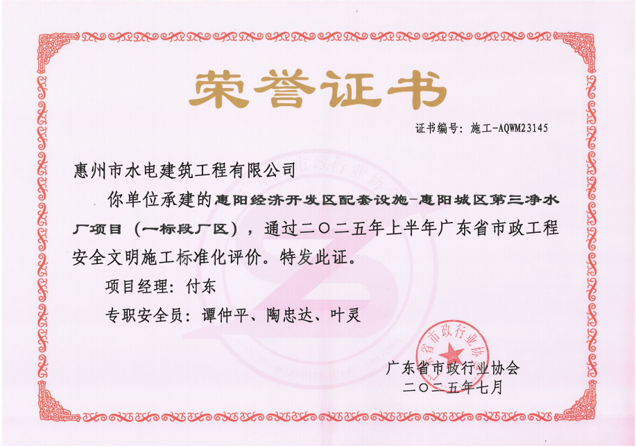 近日,廣東省市政行業(yè)協(xié)會傳來喜訊,由我司承建的惠陽經(jīng)濟開發(fā)區(qū)配套設(shè)施—惠陽城區(qū)第三凈水廠項目(一標段廠區(qū)),順利通過2025年上半年“廣東省市政工程安全文明施工標準化”評價。這一榮譽不僅是對我司項目管理與施工水平的高度肯定,更是對我司始終堅持高標準、嚴要求推進安全文明施工的生動詮釋,為行業(yè)樹立了可借鑒、可推廣的標桿典范。